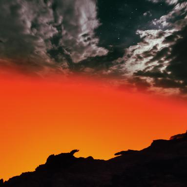La première photographie, faite de nuit, ne montrent que l'illumination des fumées par le lac de laves. La seconde est le levé du soleil à travers le panache du volcan.