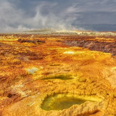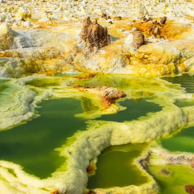 Le Dallol est une zone volcanique d'activité solfatarienne qui présente d'innombrables sources chaudes très acides, riches en divers éléments chimiques, dont le soufre, qui forment des concrétions et des bassins aux couleurs surréalistes.