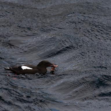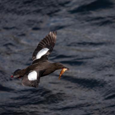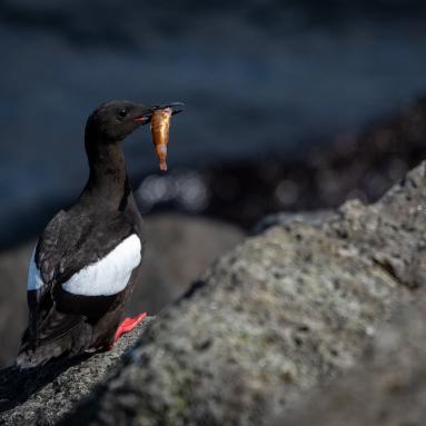 Un pêcheur noiraud aux taches alaires blanches et aux pieds rouges.