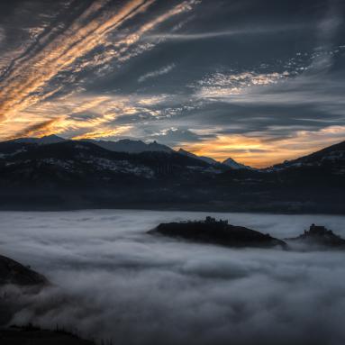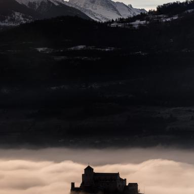 Cela ne se produit qu'une ou deux fois par hiver et ne dure que quelques heures tôt le matin, avant que le soleil ne lèche le sommet du brouillard. Il faut donc être à l'affût de ce genre de situation et se préparer à partir à l'aube dans les vignes givrées dominant Sion.