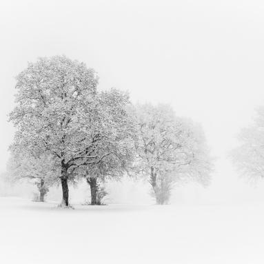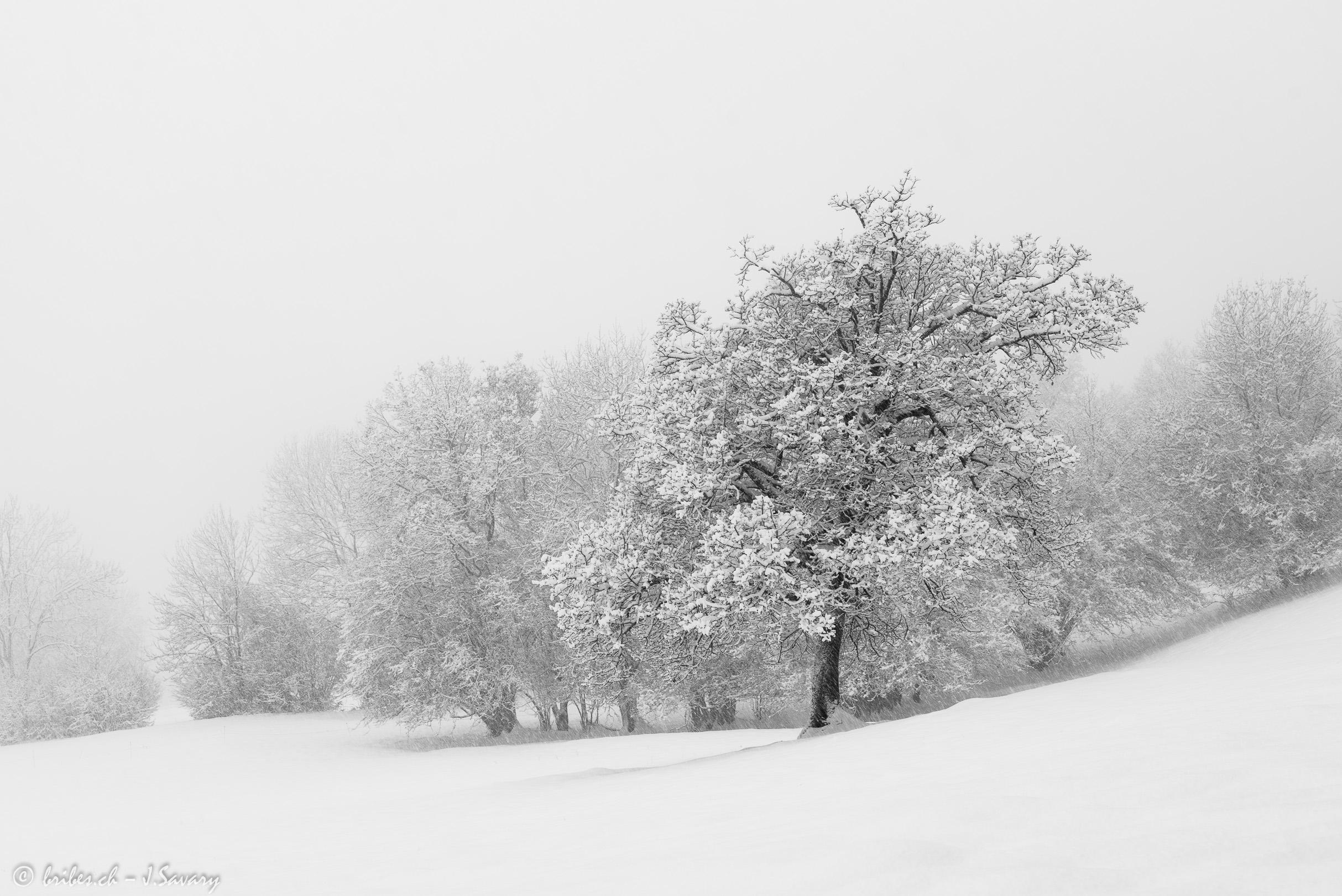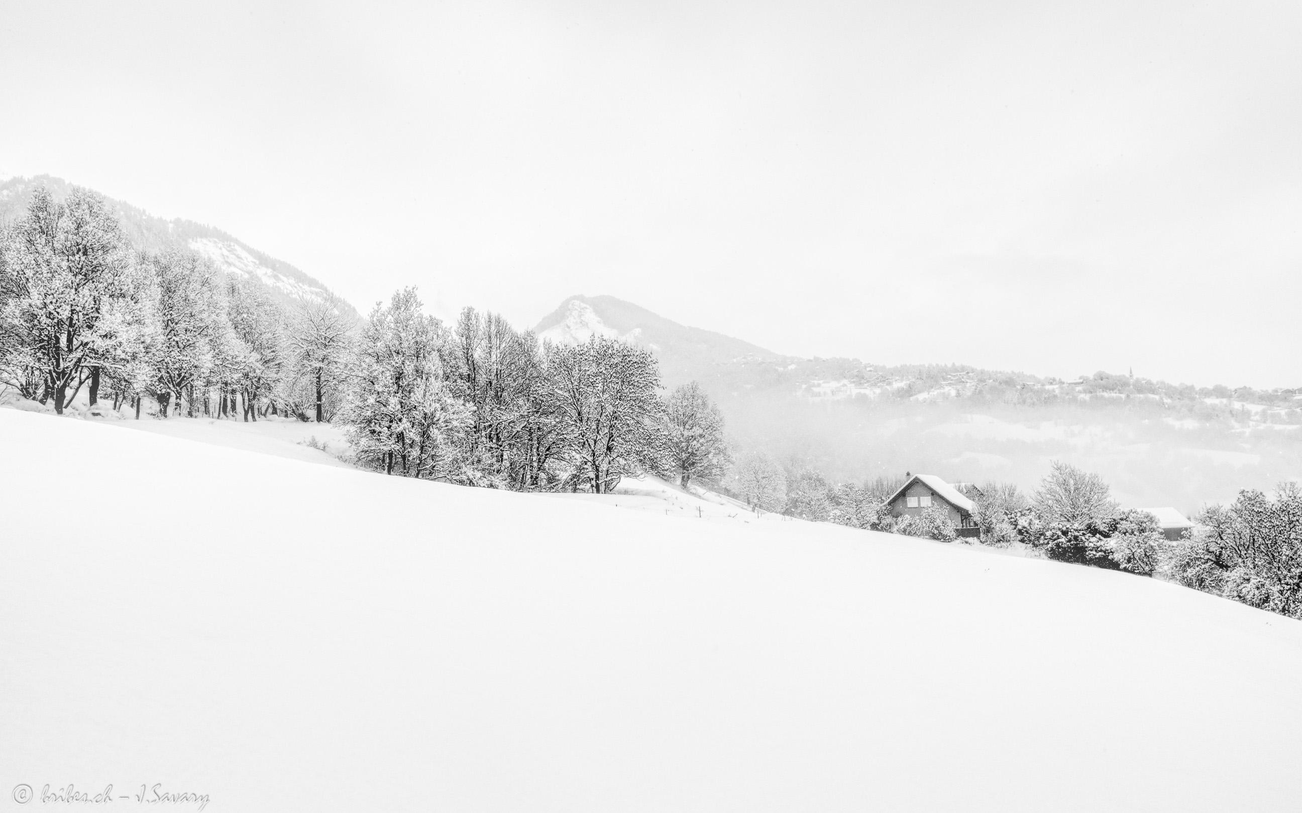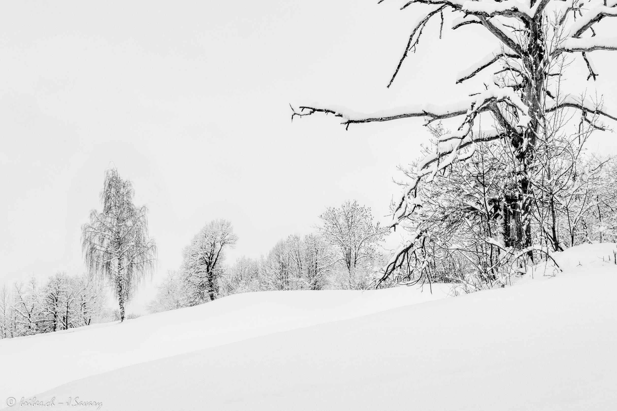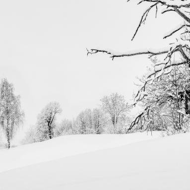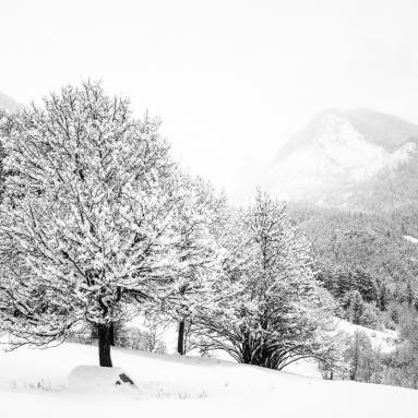 Je privilégie le moment où la neige tombe avec son ambiance ouatée et son silence qui favorisent le sentiment de solitude. La neige et la faible visibilité estompent les traces humaines; barrières, lignes aériennes et chalets disparaissent.
