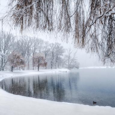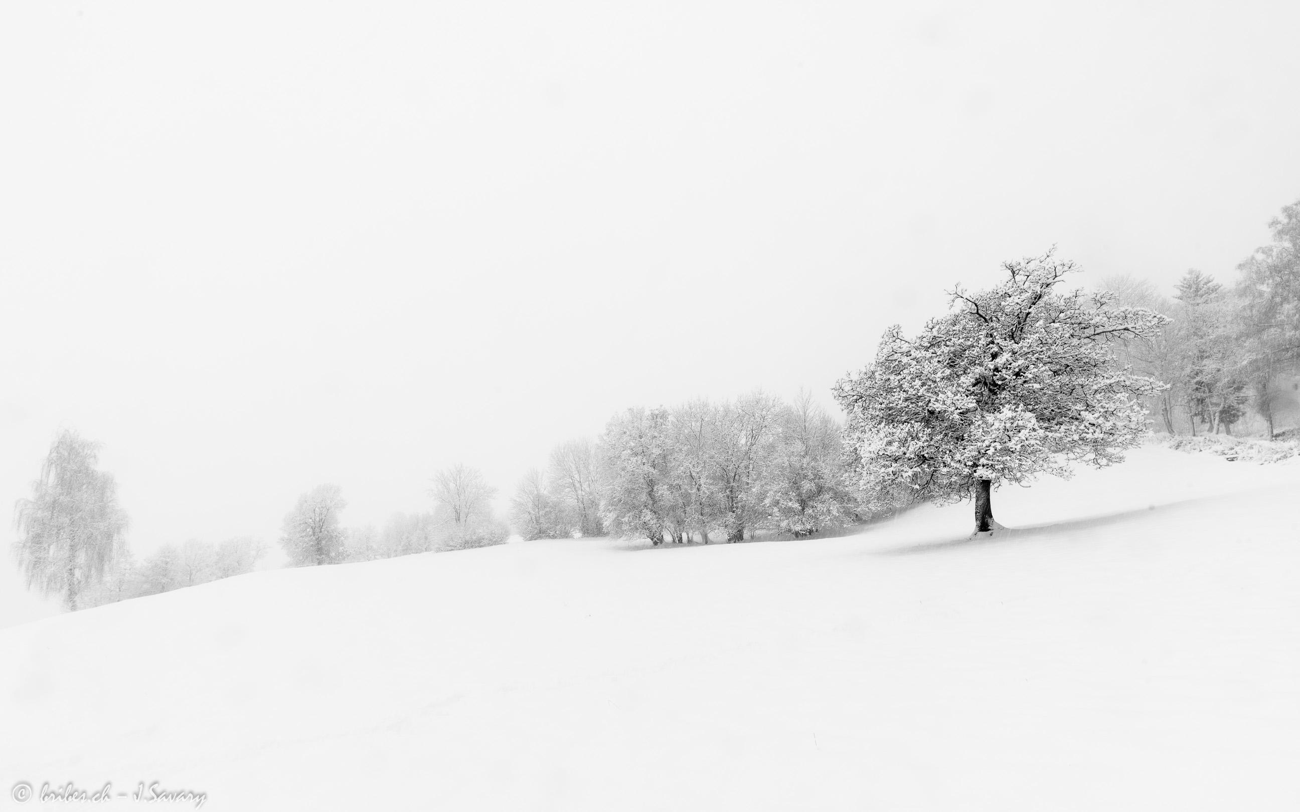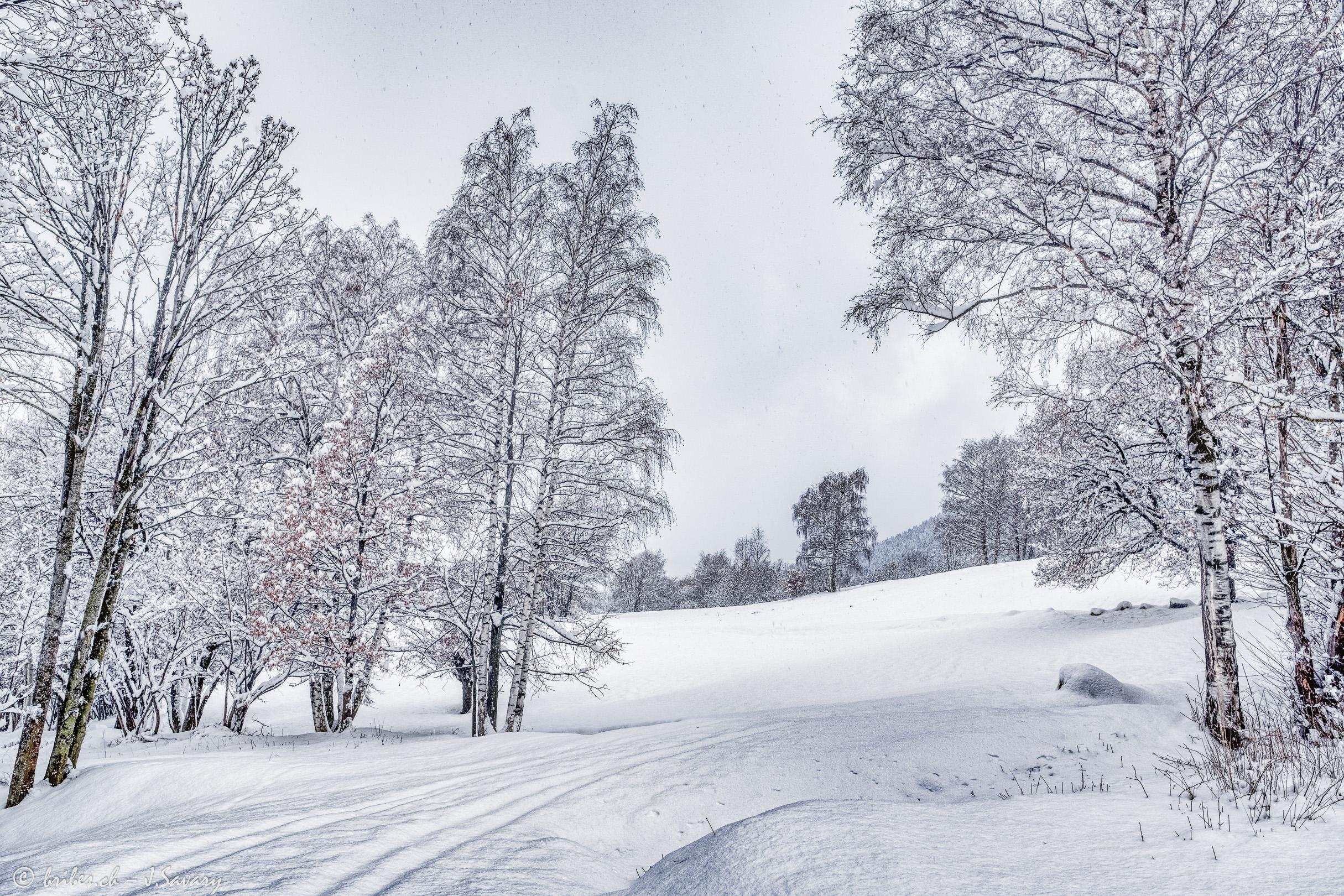 Quand il neige, j'adore partir à pieds de chez moi pour aller dans les hauts de mon village, sur le plateau de Binii qui offre un ravissant paysage de bocage. Il s'y trouve de magnifiques chênes et d'autres essences d'arbres. Les praires sont entrecoupées de haies sauvages et ponctuées de nombreux petits lacs.
