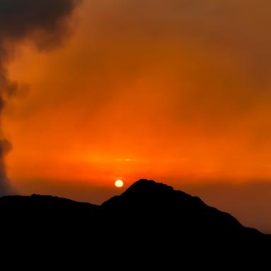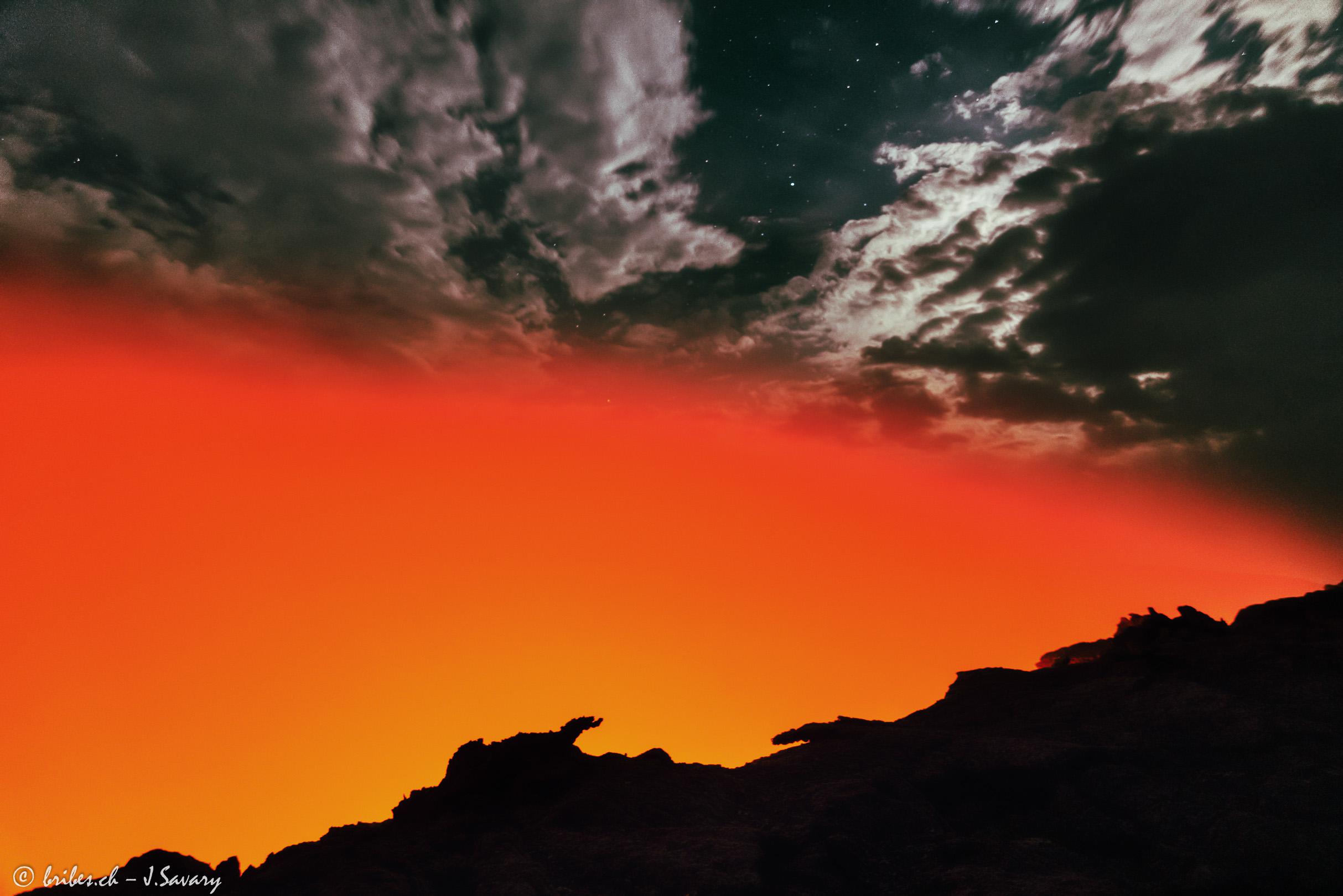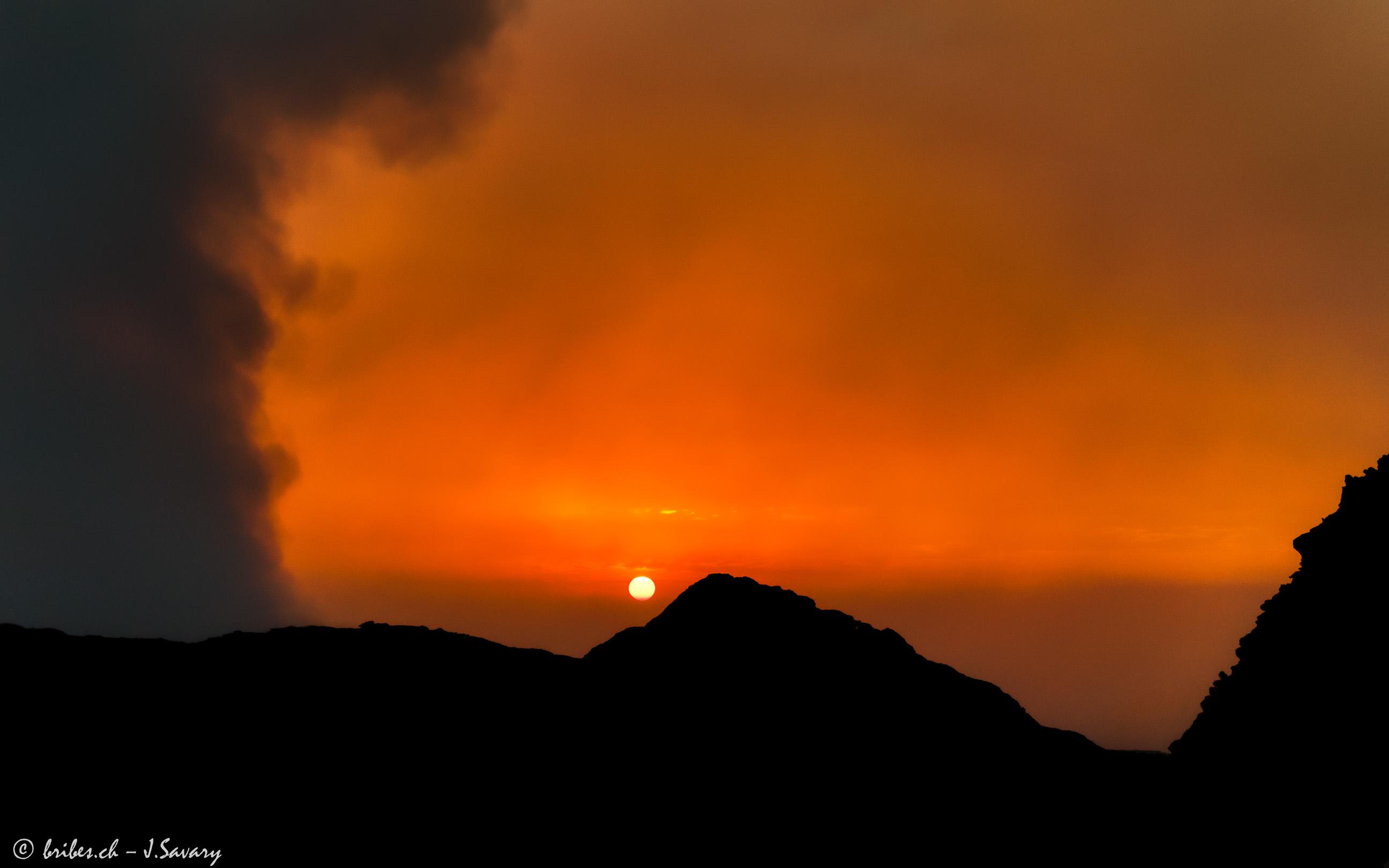 La première photographie, faite de nuit, ne montrent que l'illumination des fumées par le lac de laves. La seconde est le levé du soleil à travers le panache du volcan.