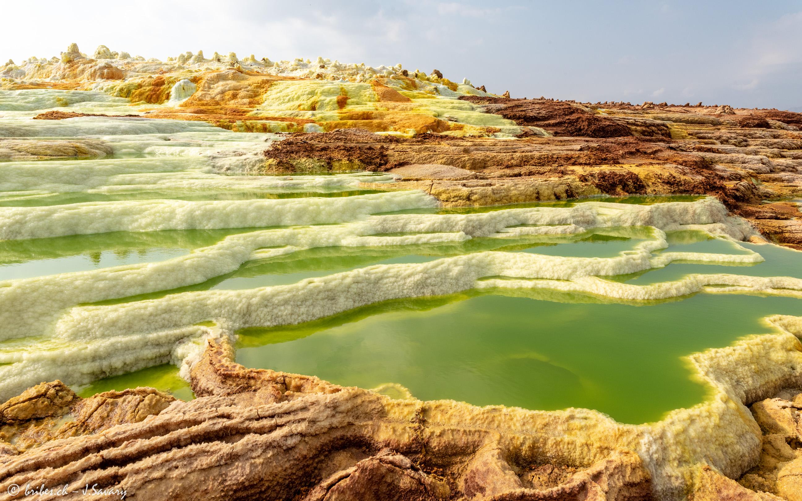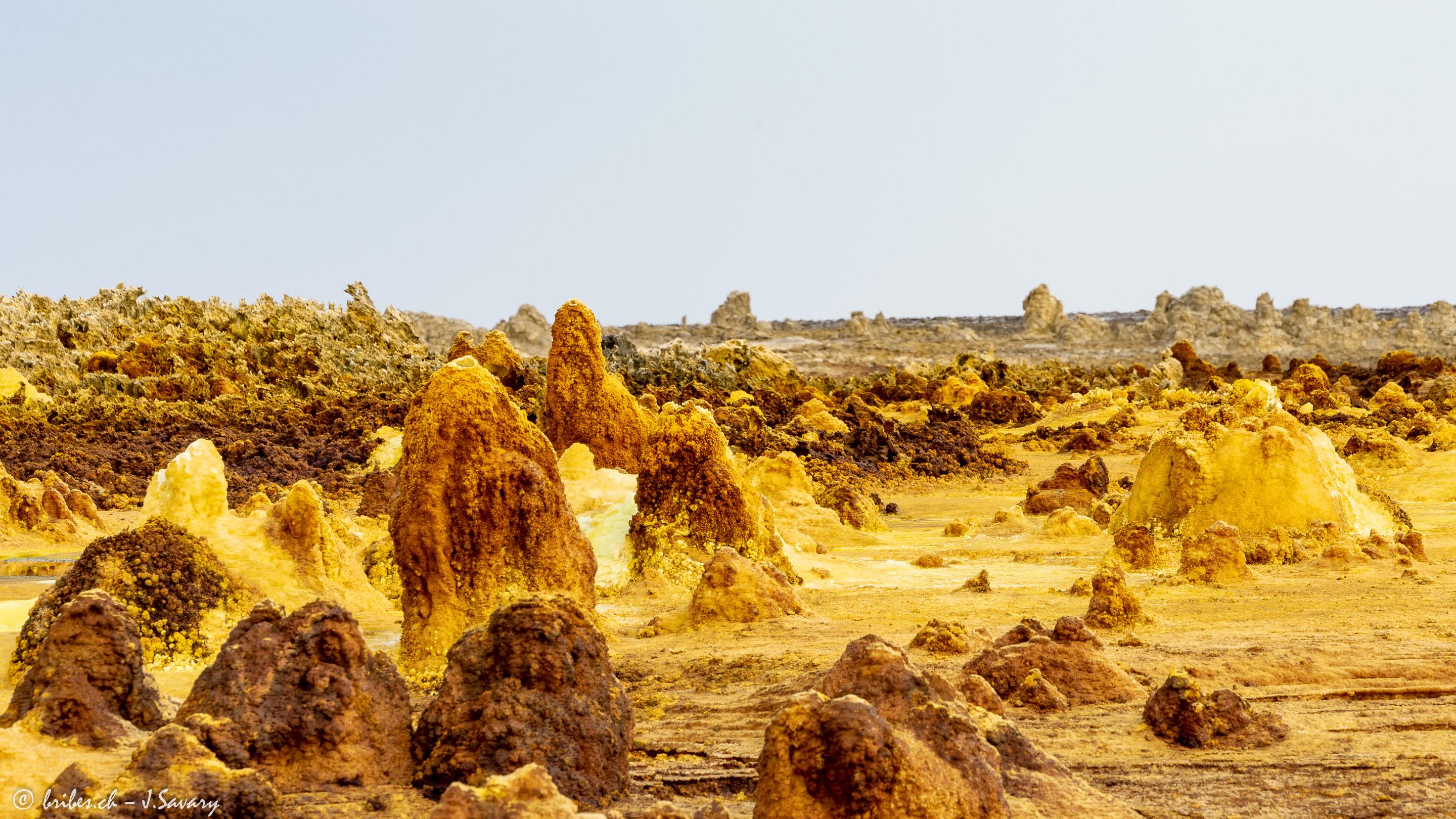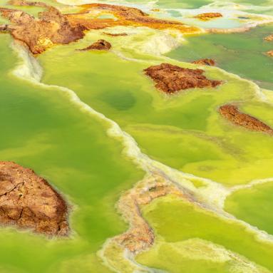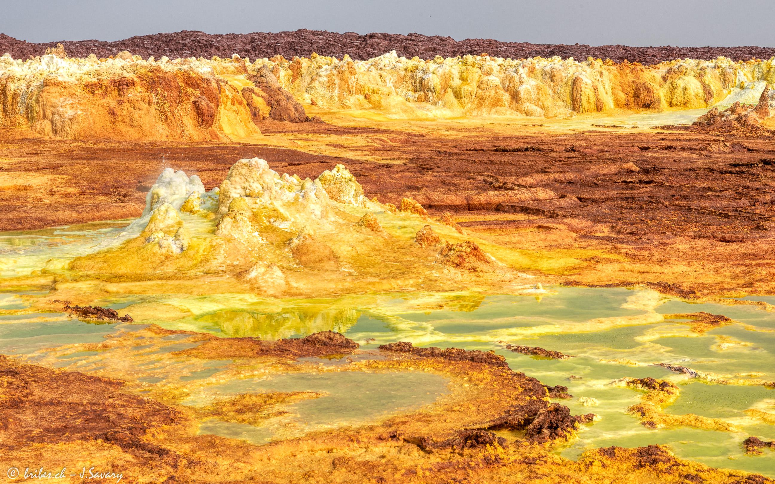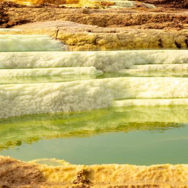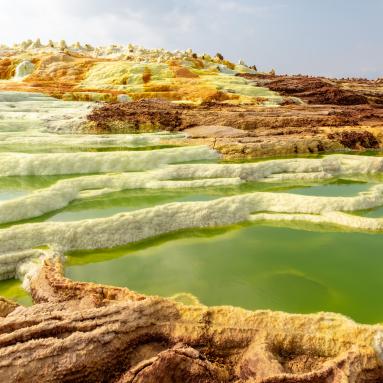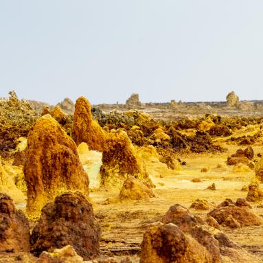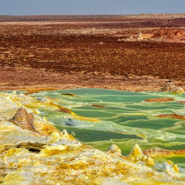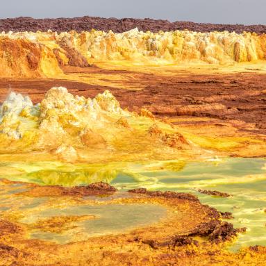 Le Dallol est une zone volcanique d'activité solfatarienne qui présente d'innombrables sources chaudes très acides, riches en divers éléments chimiques, dont le soufre, qui forment des concrétions et des bassins aux couleurs surréalistes.