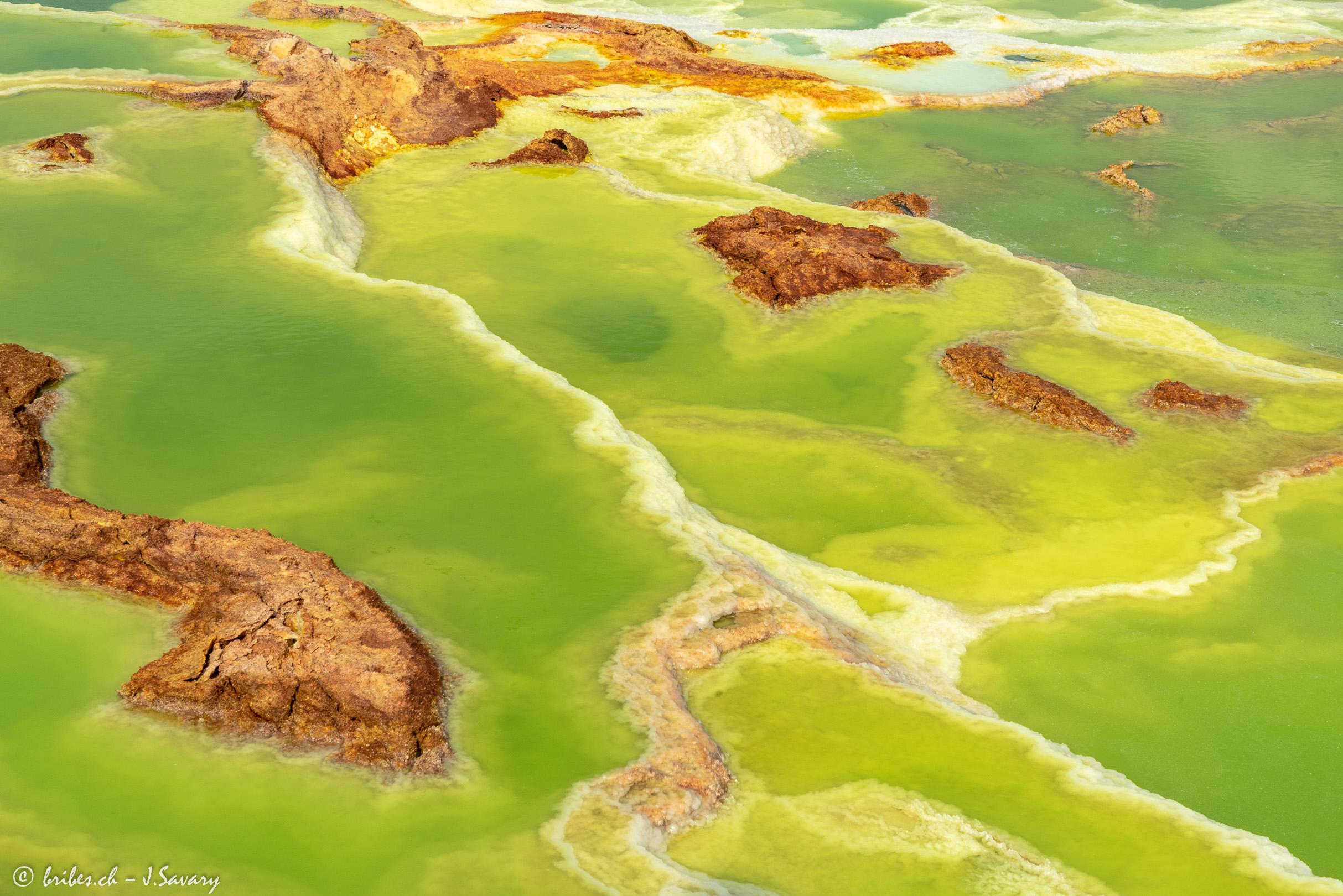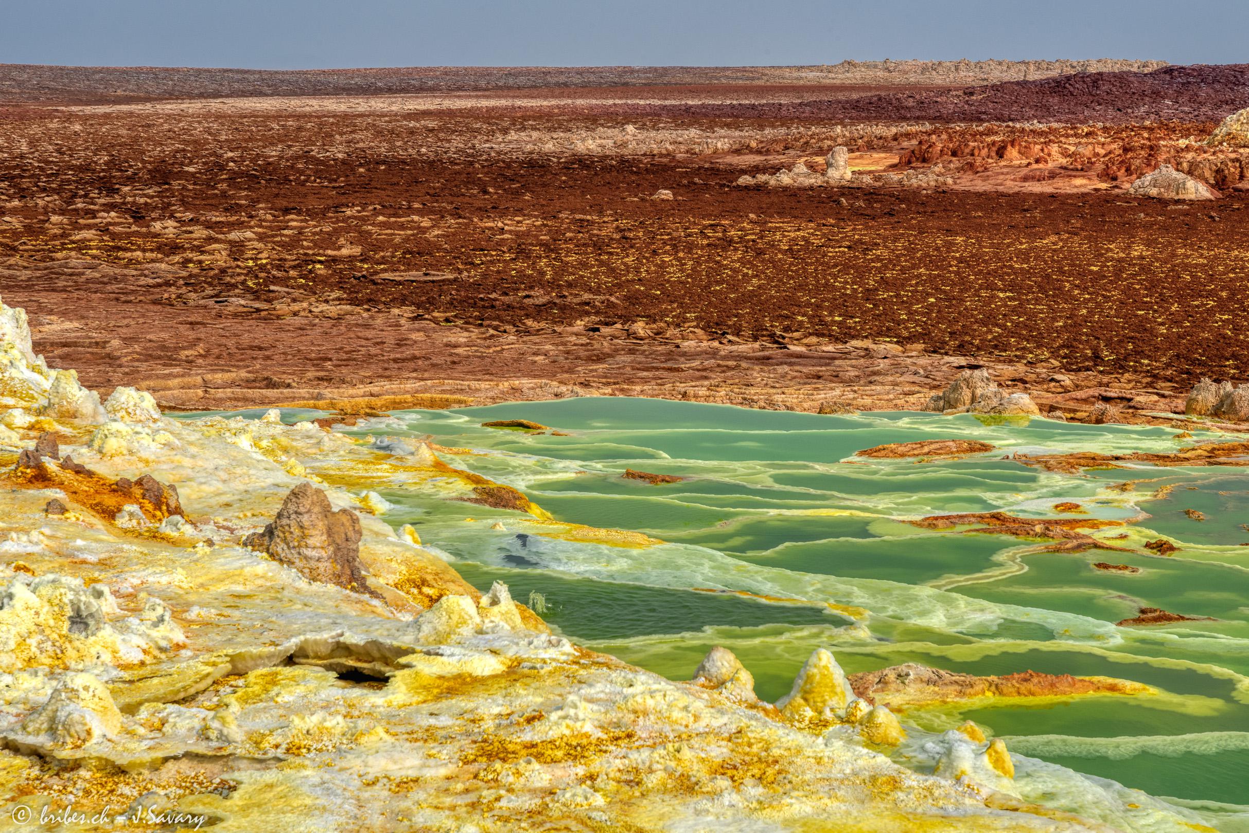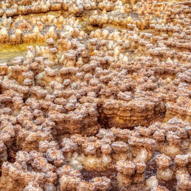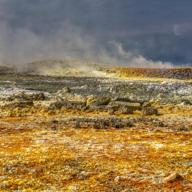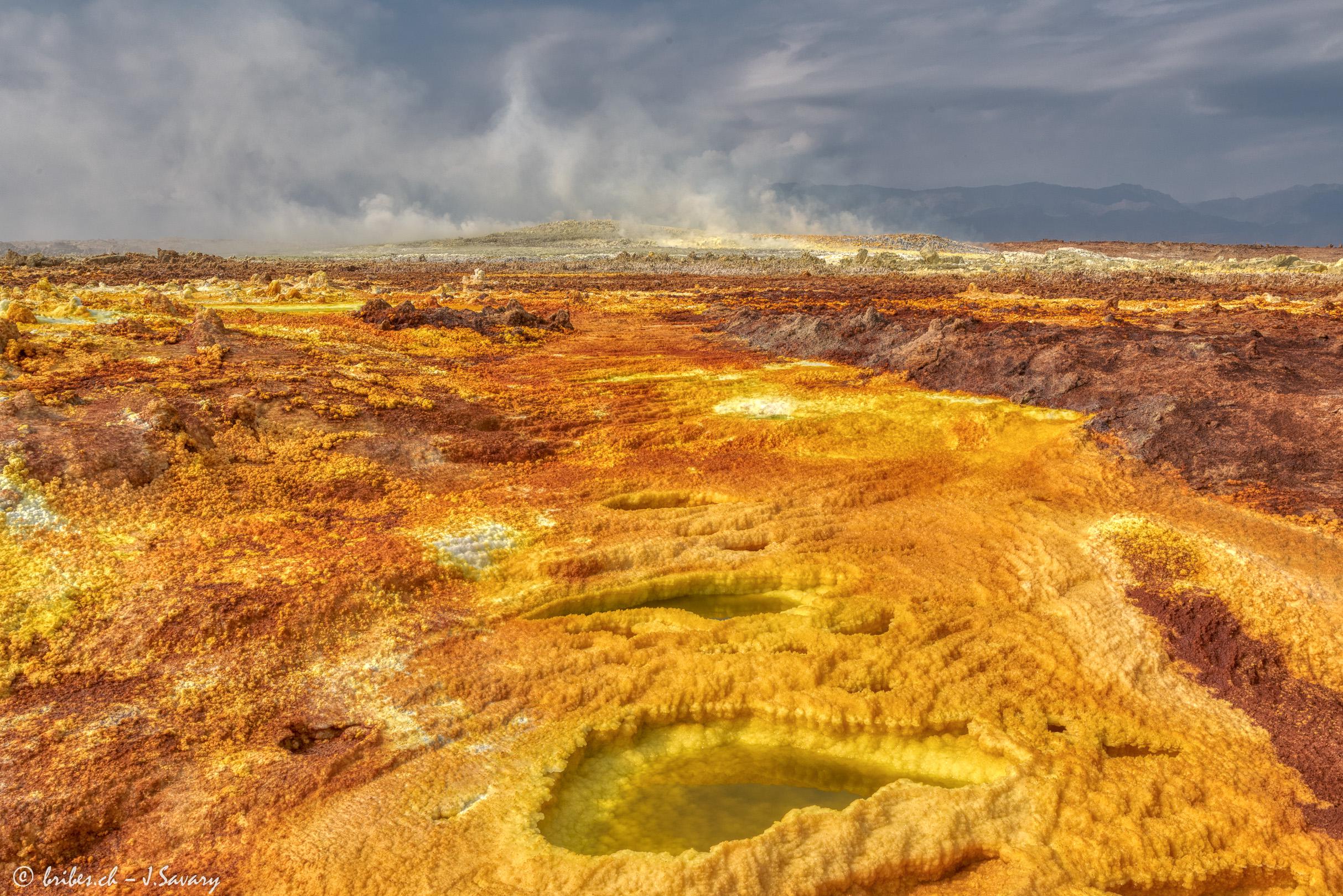 Le Dallol est une zone volcanique d'activité solfatarienne qui présente d'innombrables sources chaudes très acides, riches en divers éléments chimiques, dont le soufre, qui forment des concrétions et des bassins aux couleurs surréalistes.