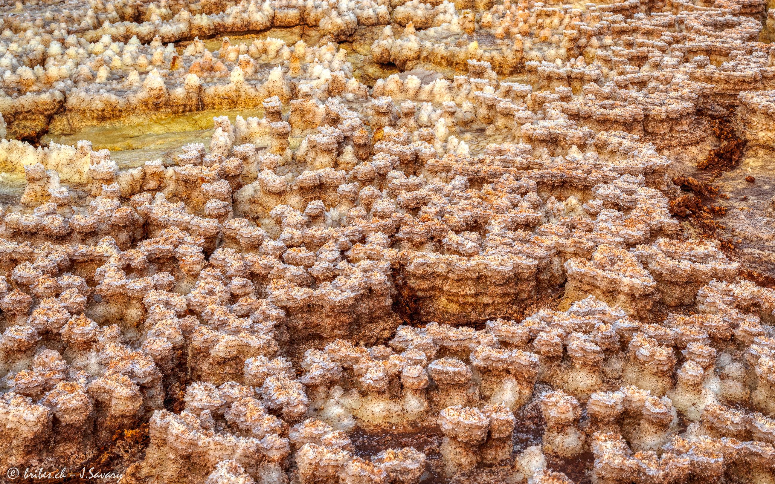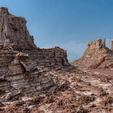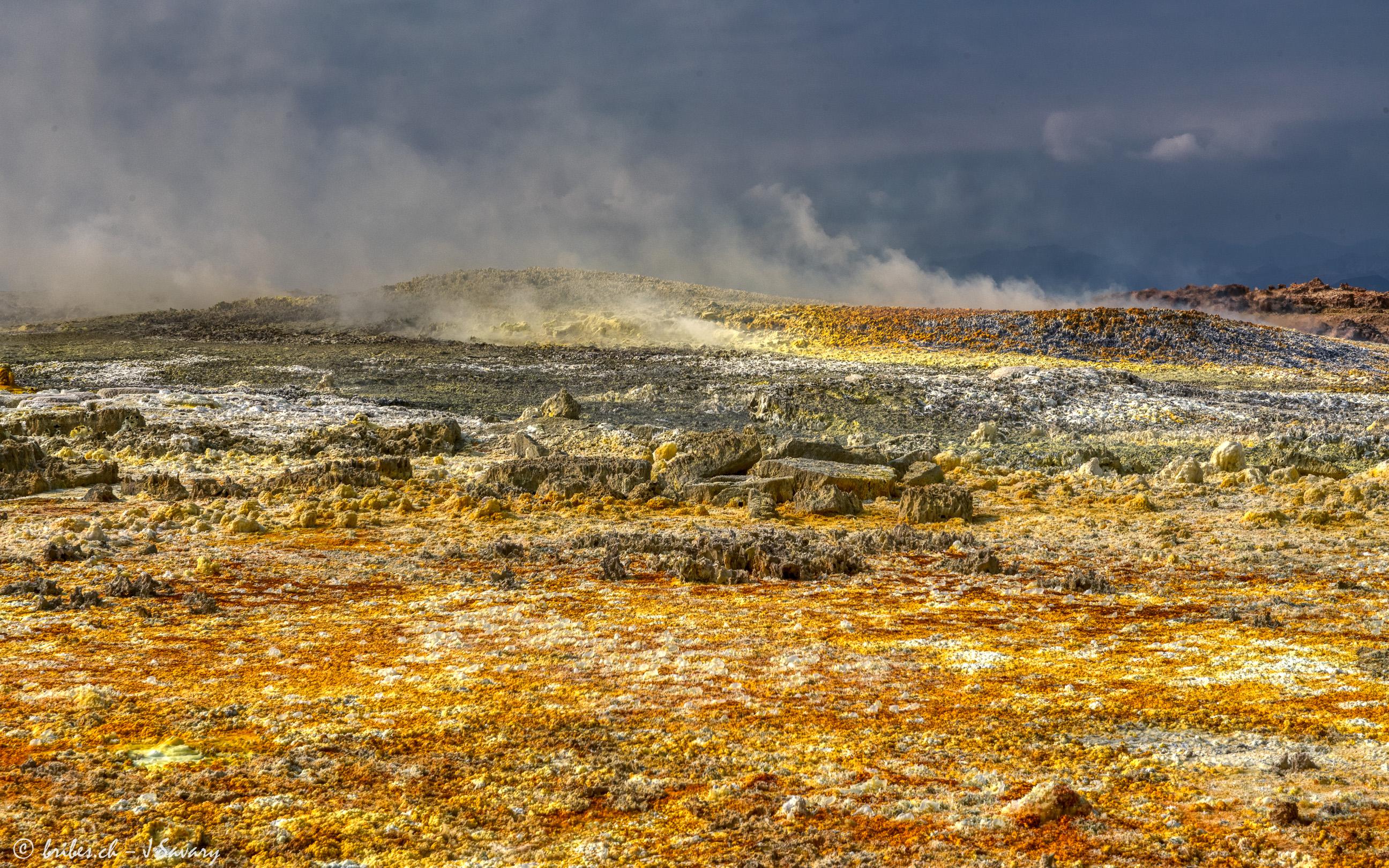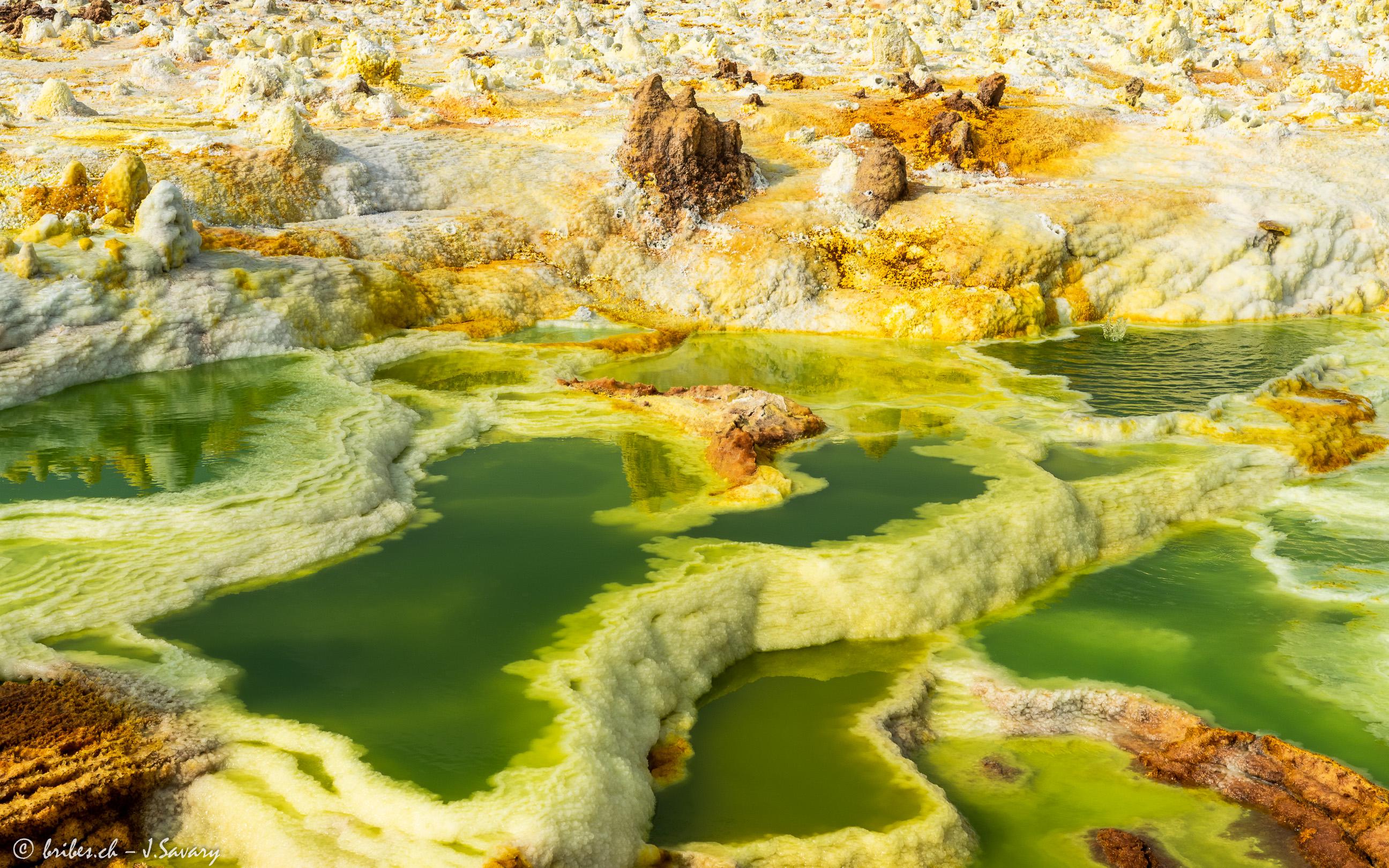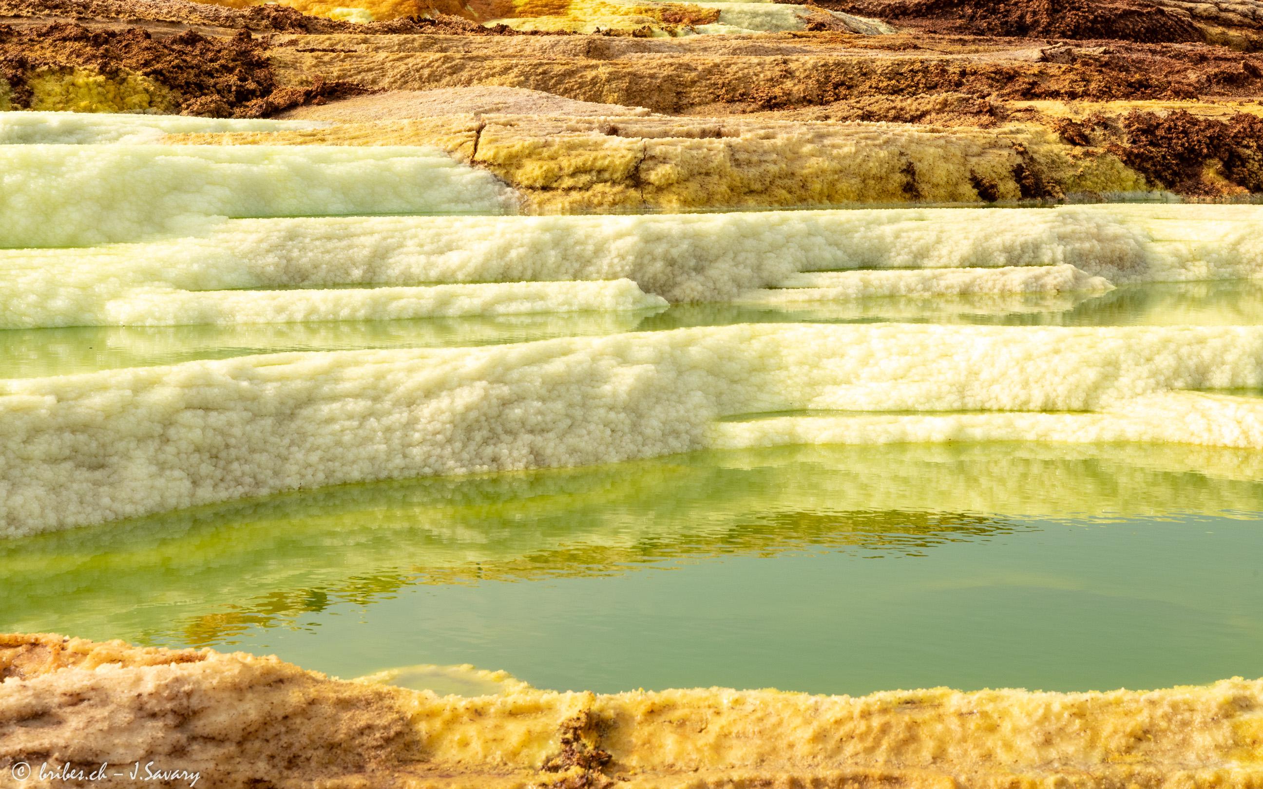 Le Dallol est une zone volcanique d'activité solfatarienne qui présente d'innombrables sources chaudes très acides, riches en divers éléments chimiques, dont le soufre, qui forment des concrétions et des bassins aux couleurs surréalistes.