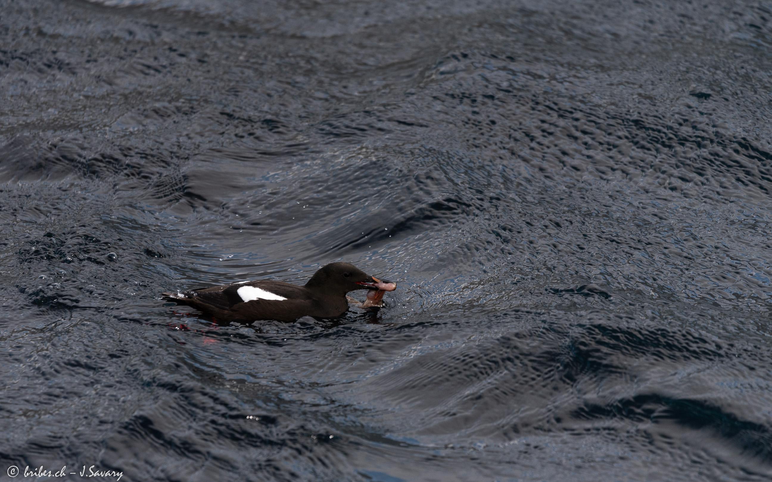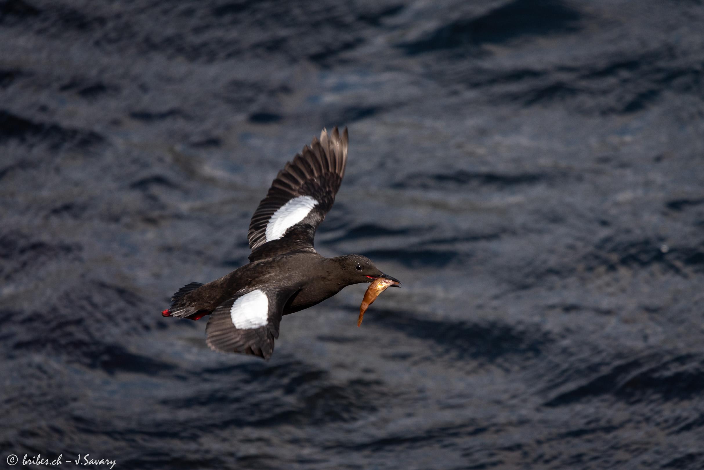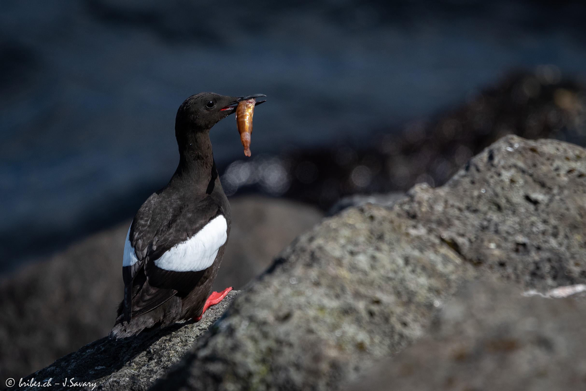 Un pêcheur noiraud aux taches alaires blanches et aux pieds rouges.