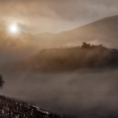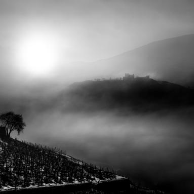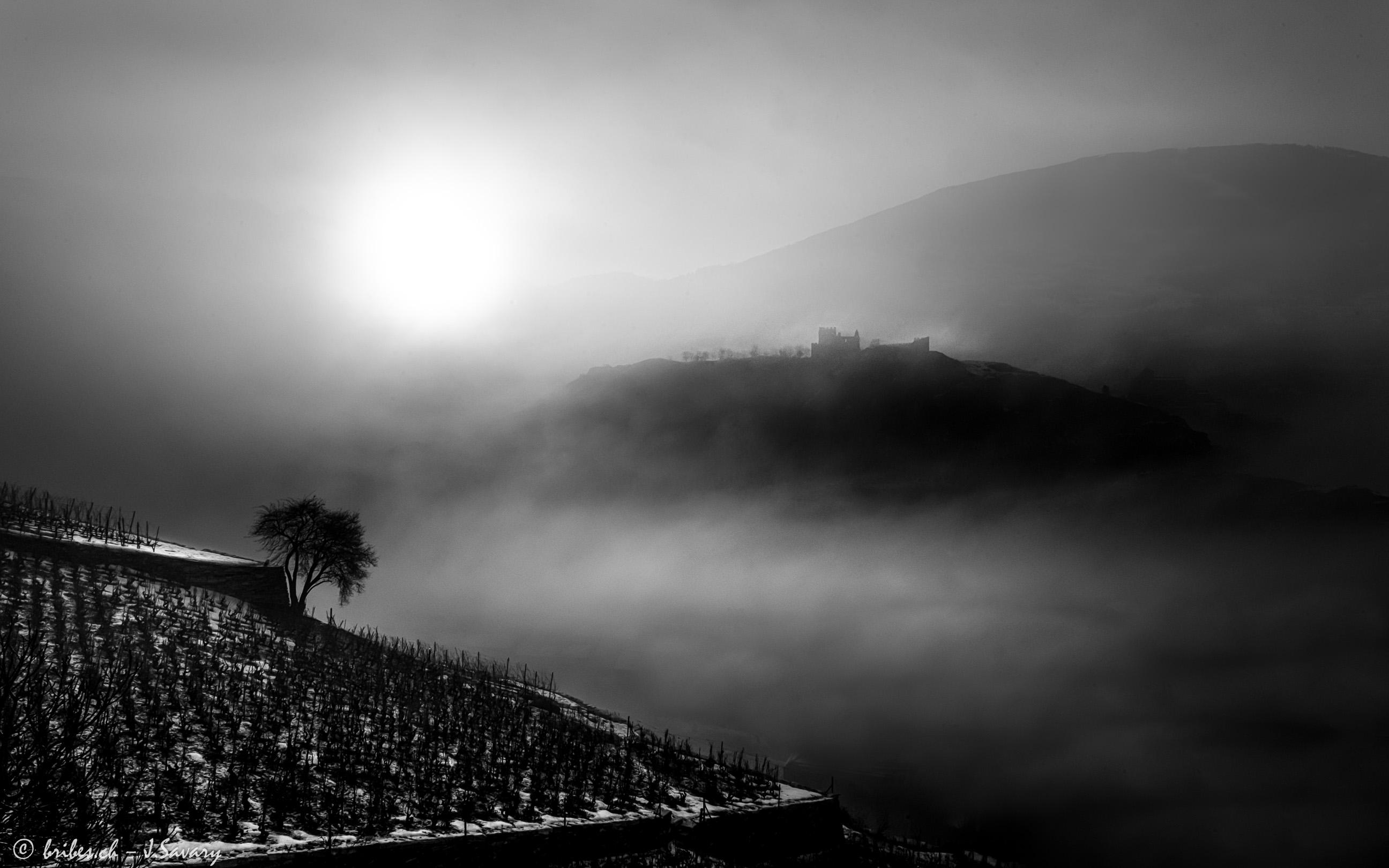 Cela ne se produit qu'une ou deux fois par hiver et ne dure que quelques heures tôt le matin, avant que le soleil ne lèche le sommet du brouillard. Il faut donc être à l'affût de ce genre de situation et se préparer à partir à l'aube dans les vignes givrées dominant Sion.